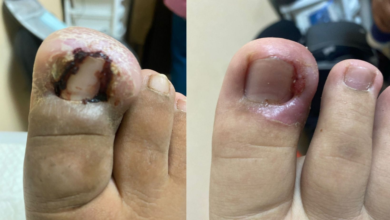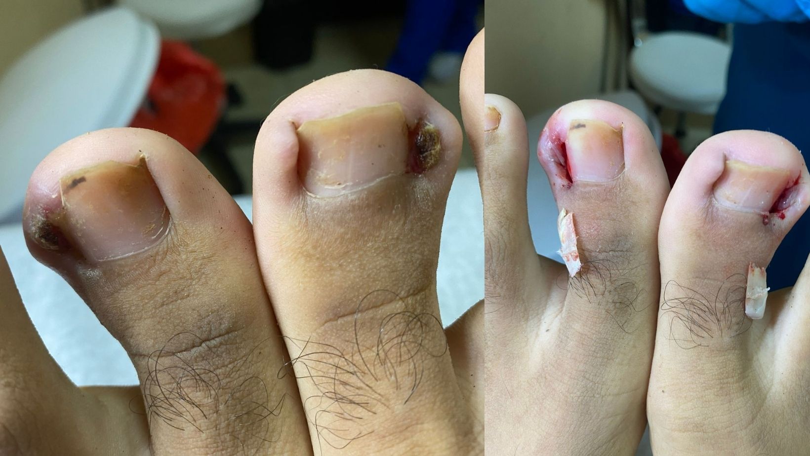 Si la uña está muy clavada, inflamada o hay presencia de granuloma, se recurre a procedimientos ambulatorios. Bajo anestesia local, extraemos cuidadosamente la porción afectada o, en casos recurrentes, parte de la matriz ungueal para evitar que la zona se regenere. Tras ello, realizamos curaciones avanzadas con apósitos de clínica de heridas.