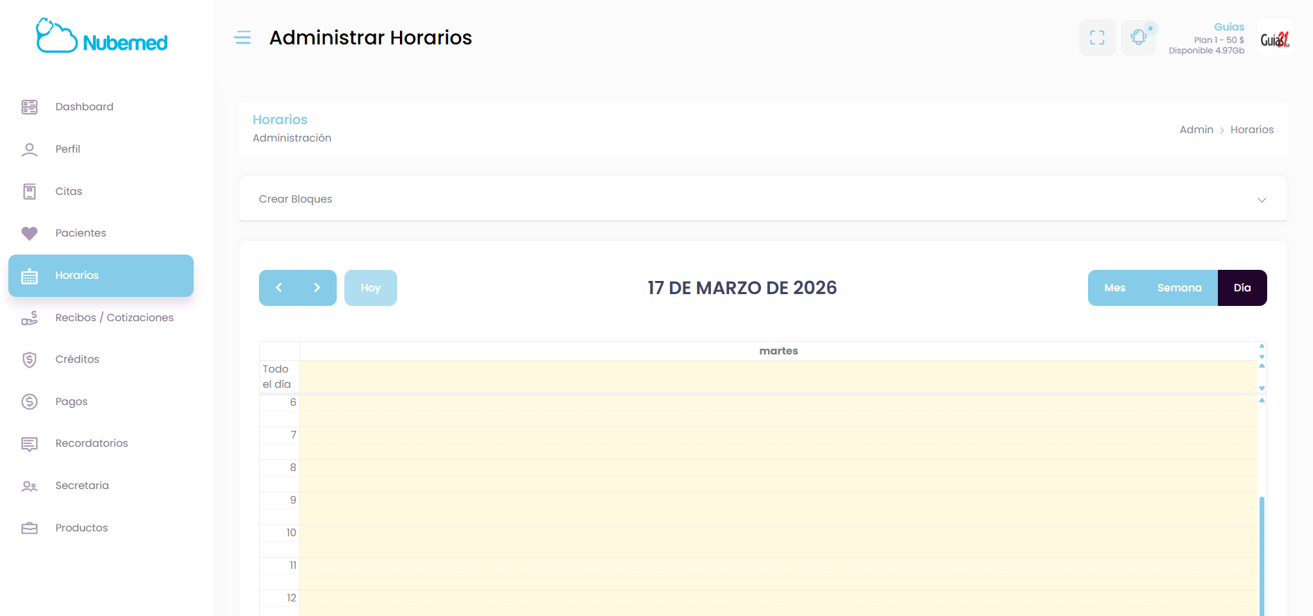 En este módulo de Nubemed podrás administrar tus horarios de atención médica, definiendo los bloques de tiempo disponibles para recibir pacientes.