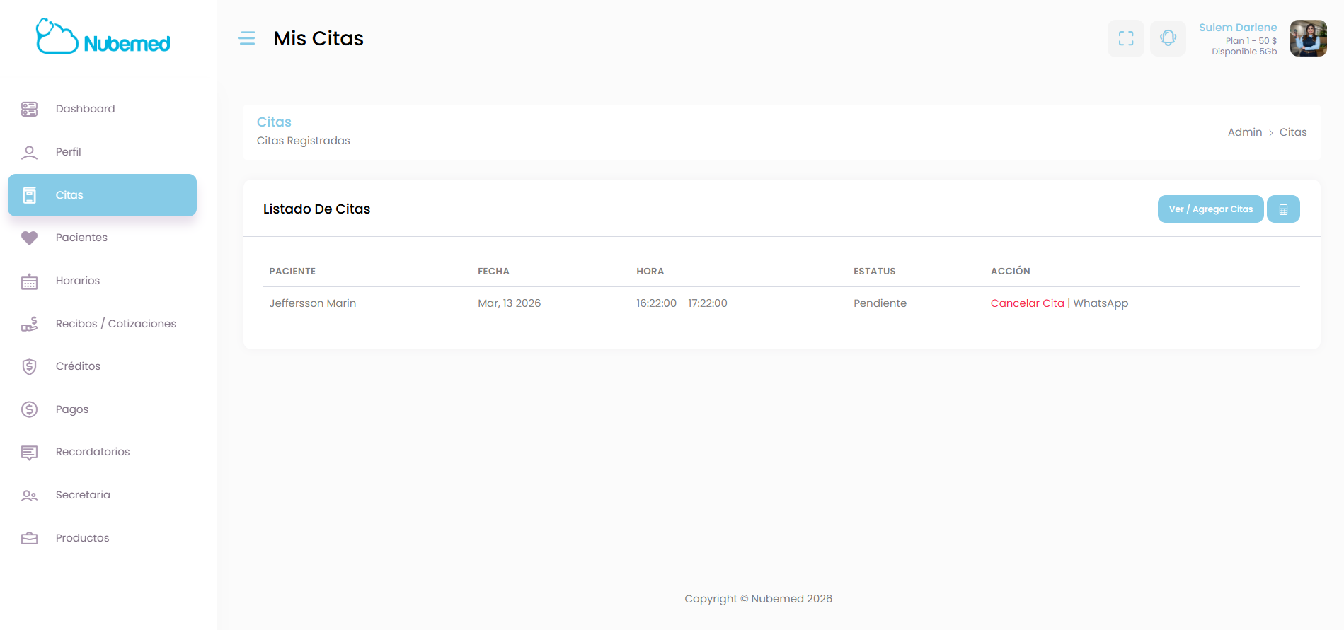 En este módulo de Nubemed podrás gestionar todas tus citas médicas registradas, ver el estado de cada una y acceder rápidamente al expediente clínico del paciente.