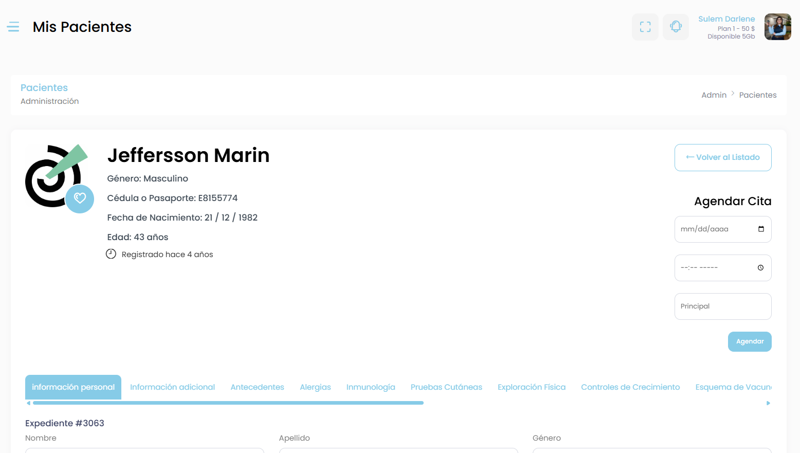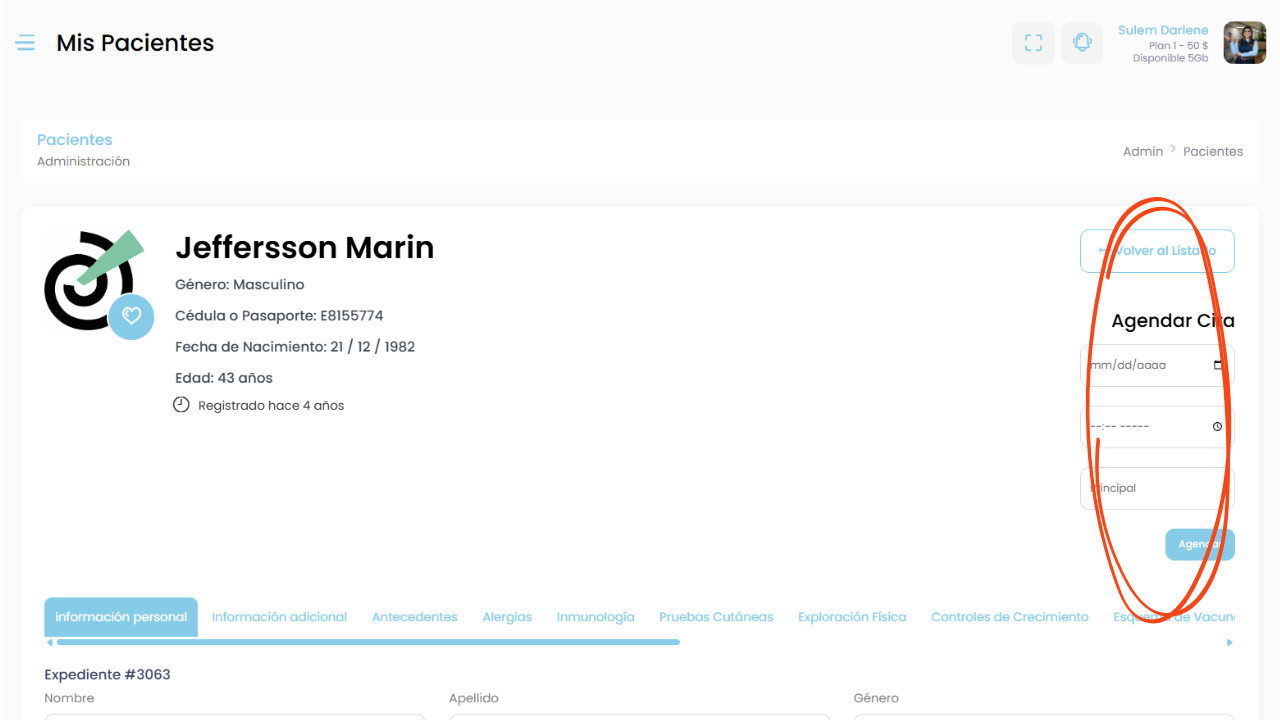En la parte superior podrás ver los datos generales del paciente, como: