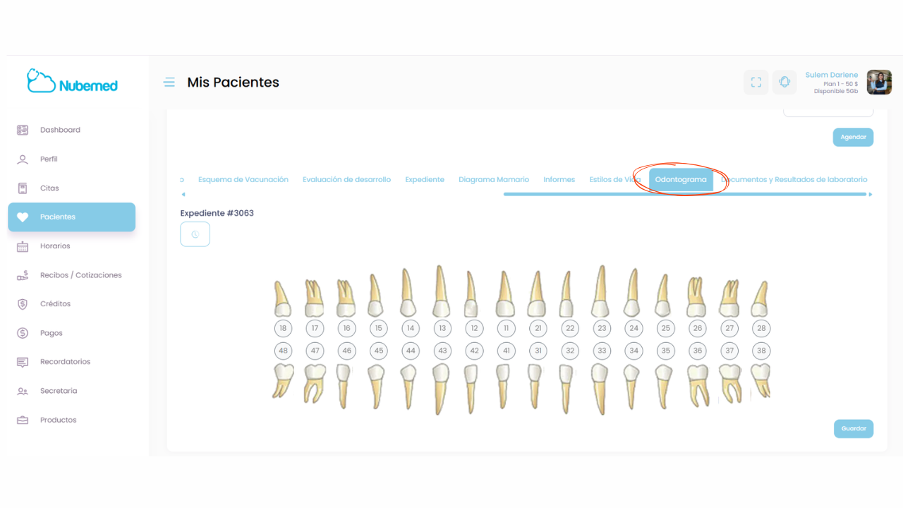 Toda la información registrada queda almacenada dentro del expediente clínico del paciente, permitiendo consultar la evolución dental en futuras consultas.