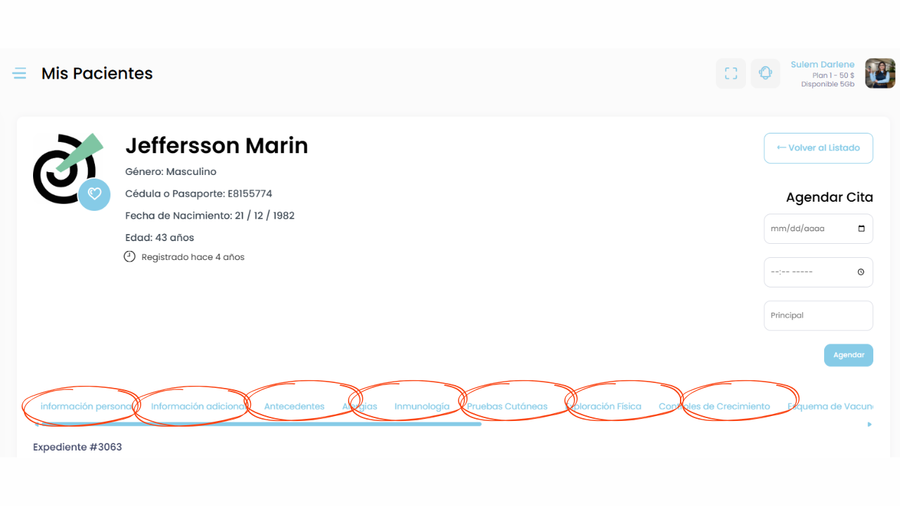 El expediente está organizado en diferentes secciones médicas, que te permiten registrar y consultar información importante del paciente, como por ejemplo: