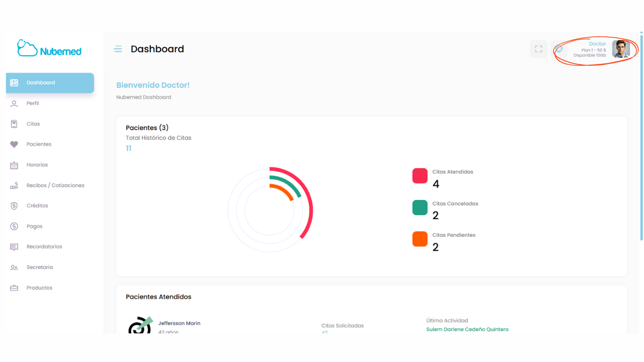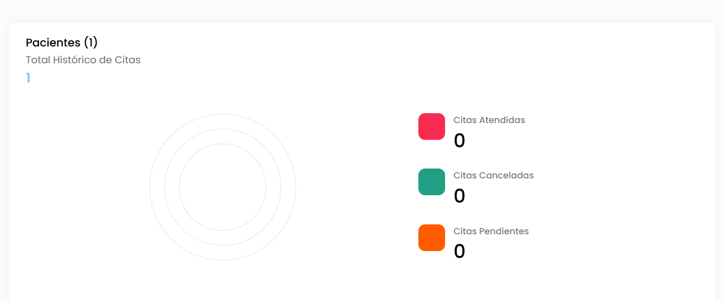 En esta sección el sistema muestra un resumen de tus pacientes registrados y el historial de citas.