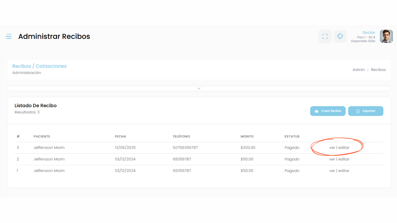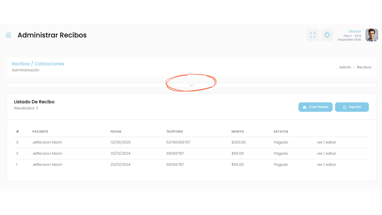 También podrás ver o editar los recibos existentes, mantener un control financiero de tu consulta y llevar un registro organizado de tus ingresos.