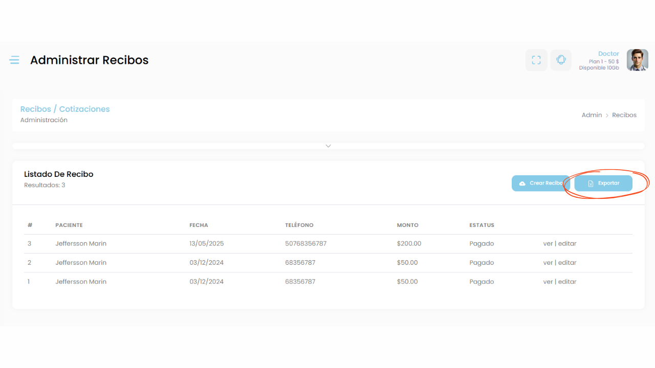 Además, el sistema te permite exportar los recibos, facilitando la gestión administrativa o contable de tu consultorio.