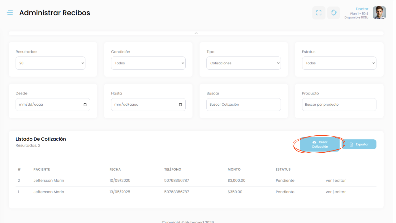“En la opción de cotizaciones, Nubemed te permite generar propuestas o presupuestos para procedimientos, tratamientos o servicios médicos antes de realizar el cobro.