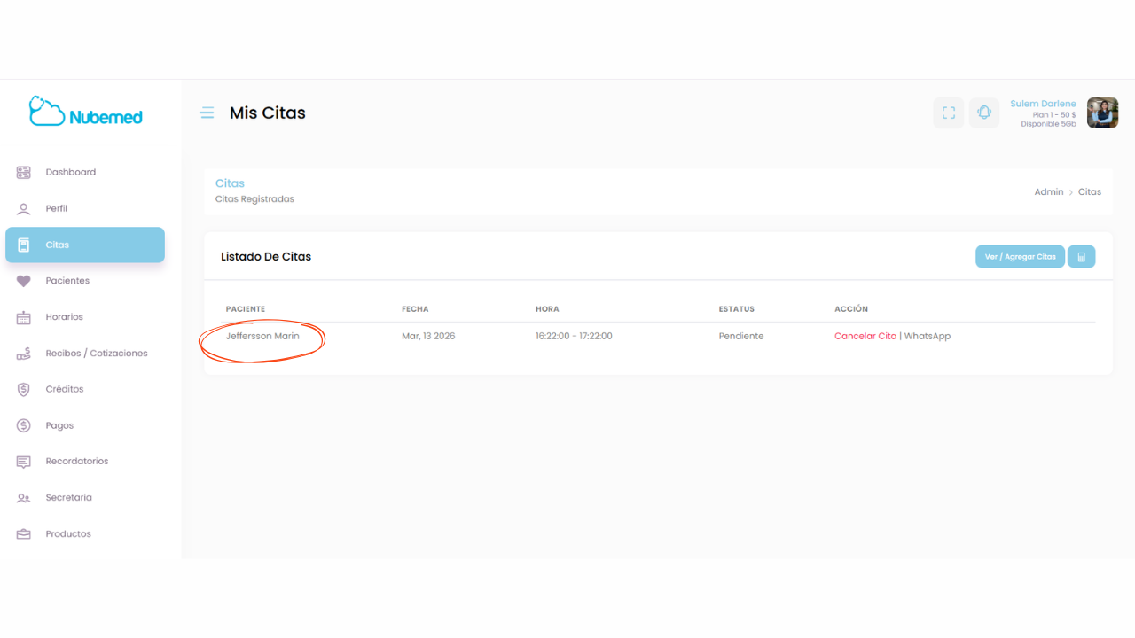 Desde aquí también podrás cancelar citas o contactar al paciente rápidamente mediante WhatsApp