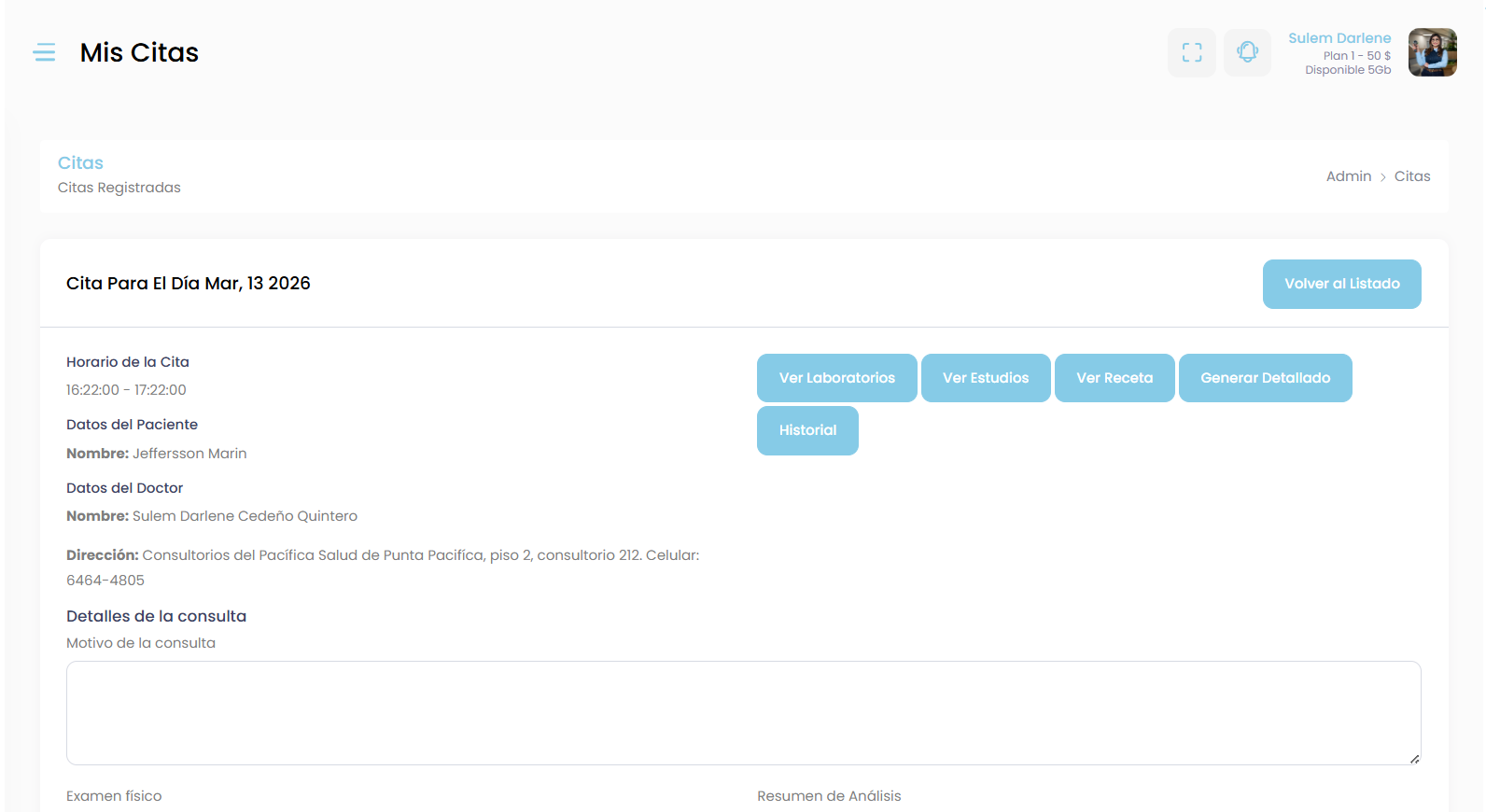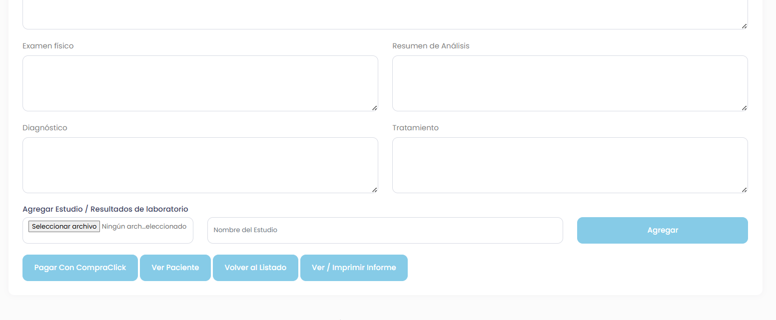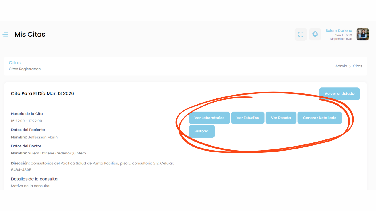 También podrás acceder al historial completo de atención del paciente, revisar consultas anteriores, informes médicos y documentos clínicos.