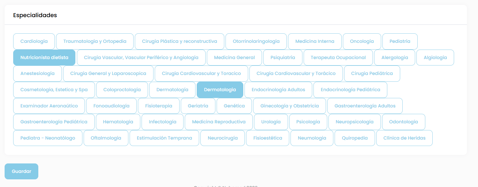 En la parte inferior podrás seleccionar las especialidades médicas que correspondan a tu práctica.