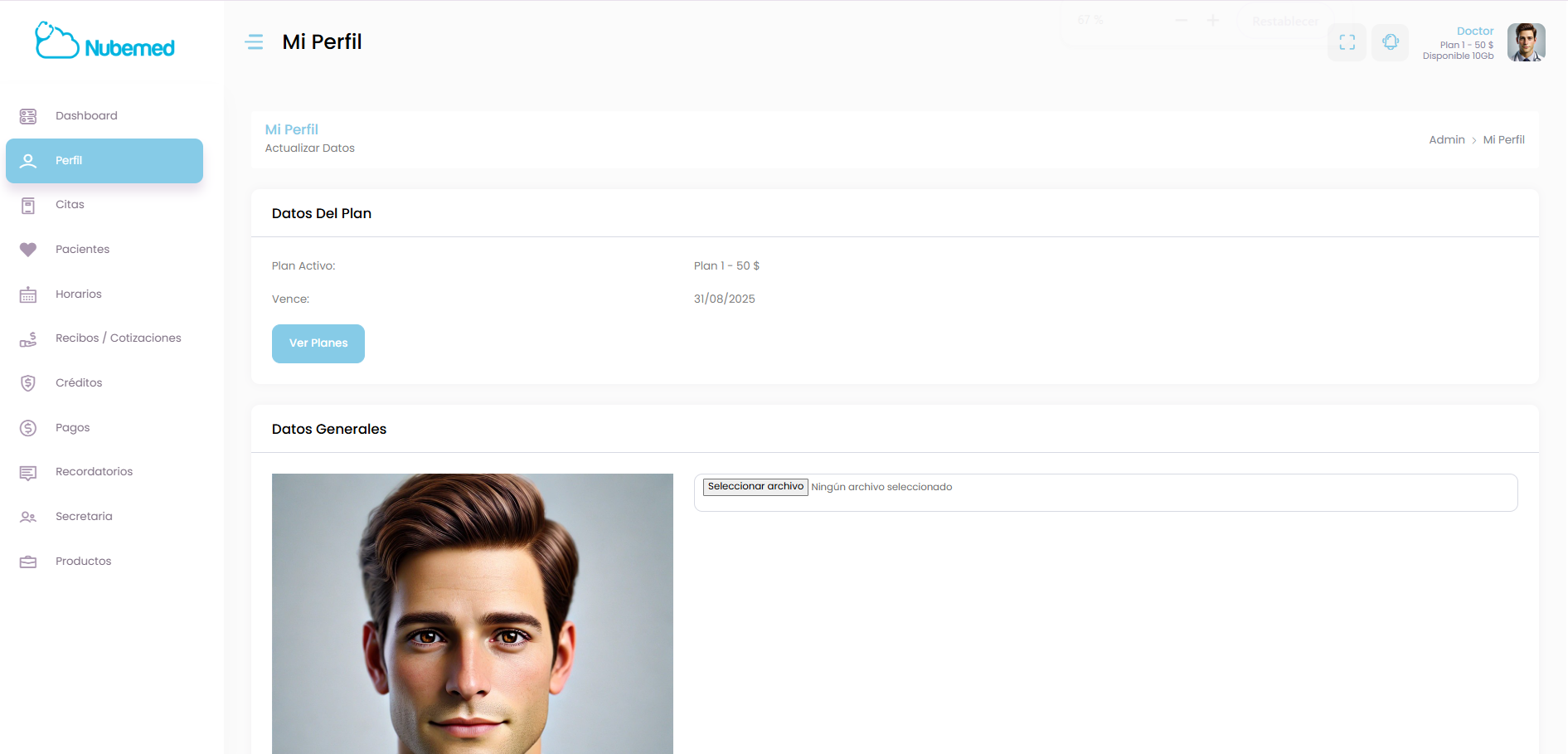 En la parte superior encontramos el panel de bienvenida y el estado de tu cuenta. Aquí puedes ver el plan activo y el espacio disponible en la nube para almacenar expedientes, documentos y archivos médicos, también tu foto de perfil publico que aparecerá en las búsquedas en nubemed.com