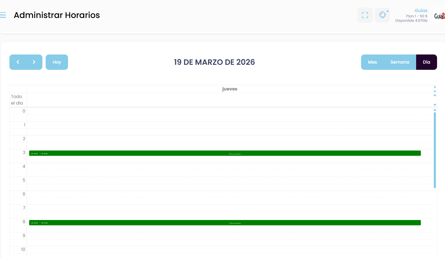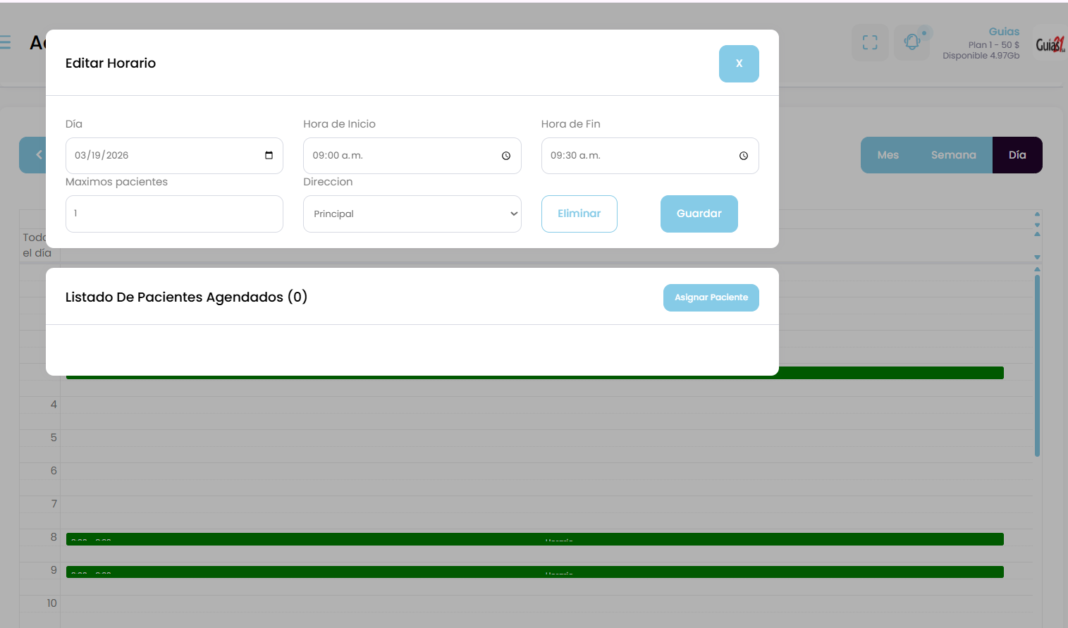 Esto te permite organizar tu disponibilidad diaria, estableciendo bloques de tiempo específicos para consultas médicas.
