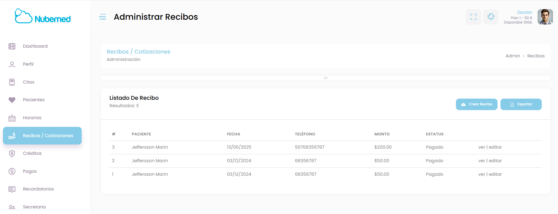 En la pantalla principal encontrarás el listado de todos los recibos generados, donde podrás ver información importante como el nombre del paciente, fecha, teléfono, monto y estado del pago.