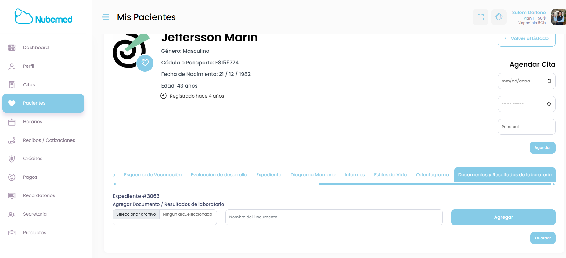 Además, Nubemed permite almacenar resultados de laboratorio, estudios médicos y otros documentos, que quedan organizados dentro del expediente del paciente.